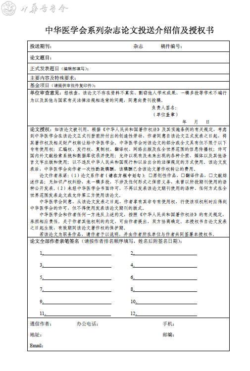 中华医学会系列杂志论文投送介绍信及授权书下载